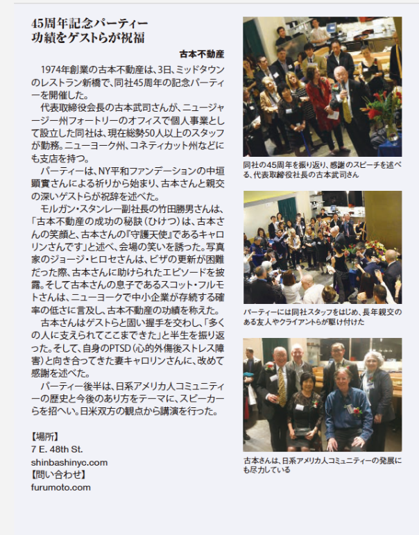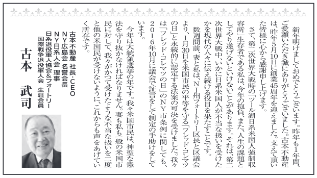 フレッド・コレマツの日は、フレッド・コレマツ氏の生まれたカリフォルニア州で10年前に制定されて以来、全米各地で認定される動きが出てきています。古本不動産のあるニュージャージー州のフォート・リー郡おいては、古本会長が郡の知事と議会に掛け合った結果、昨年1月30日がフレッド・コレマツの日として正式に制定されました。コロナによるパンデミックの中、今年で2年目を迎える記念イベントには、たくさんの政府関係者、在ニューヨーク総領事館、日系コミュニティーの方々からとても暖かいご祝辞の言葉とビデオレターをいただきました。その様子は、Tak &Carol Furumoto のYouTubeにてご覧いただけます: