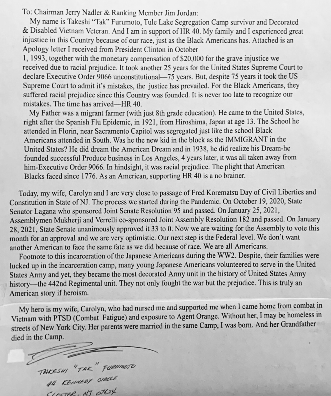 アフリカ系アメリカ人の人権問題について連邦議会で提出予定のHR-40(House Resolution #40)に関連して、古本会長が第二次世界大戦中の日系アメリカ人強制収容所での自身の経験などを交えた証言書を提出しました。