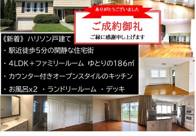 (ご成約済)Harrison戸建 $5,000 4LDK+セカンド・リビング 186㎡ セントラルA/C、冷蔵庫、洗濯機 等々 ほとんどの設備をアップデートしたばかりの駅至近(徒歩5~6分)の超優良物件です。20畳以上ある広々LD、キッチンはオープンタイプでカウンター付きなので使い勝手が良いと評判です。セカンド・リビングからは、お庭が一望でき、引き戸を開ければウッドデッキとお庭に直接出ることができるので、お友達を呼んでBBQパーティーを開くもよし、お庭の見える開放感を活かしてホームオフィスにするもよし、マルチに使えるエキストラスペースがあるお家は、ウエストチェスターでもなかなか見つかりません。良くお手入れされたお庭もお勧めポイントの一つ。5/1入居可。