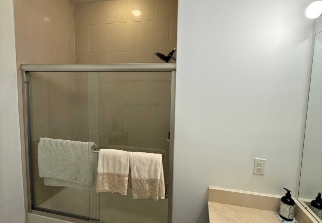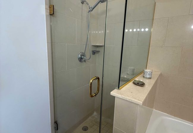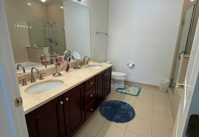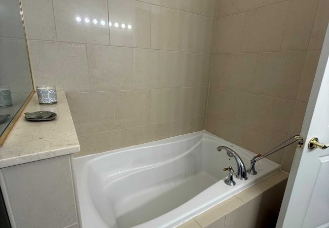メインスイートのバスルームはバスタブとシャワーが独立。室内に洗濯機・乾燥機も完備。住民専用施設にはジムやイベントスペース、キッチン設備が整っております。